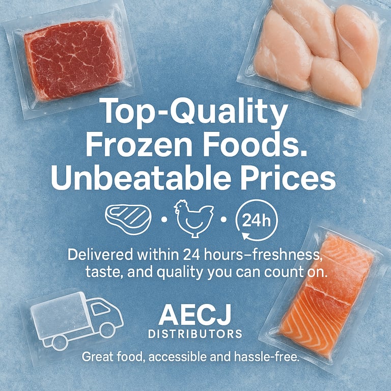 At AECJ Distributors, our mission is simple — to bring top-quality frozen food straight to your door at unbeatable prices. We carefully source and select every product, from juicy, flavorful steaks to tender, succulent chicken and the freshest seafood, ensuring that each item meets our high standards for freshness, taste, and quality.