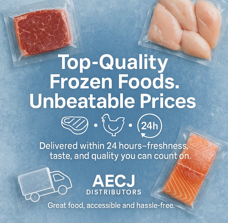 At AECJ Distributors, our mission is simple — to bring top-quality frozen food straight to your door at unbeatable prices. We carefully source and select every product, from juicy, flavorful steaks to tender, succulent chicken and the freshest seafood, ensuring that each item meets our high standards for freshness, taste, and quality.